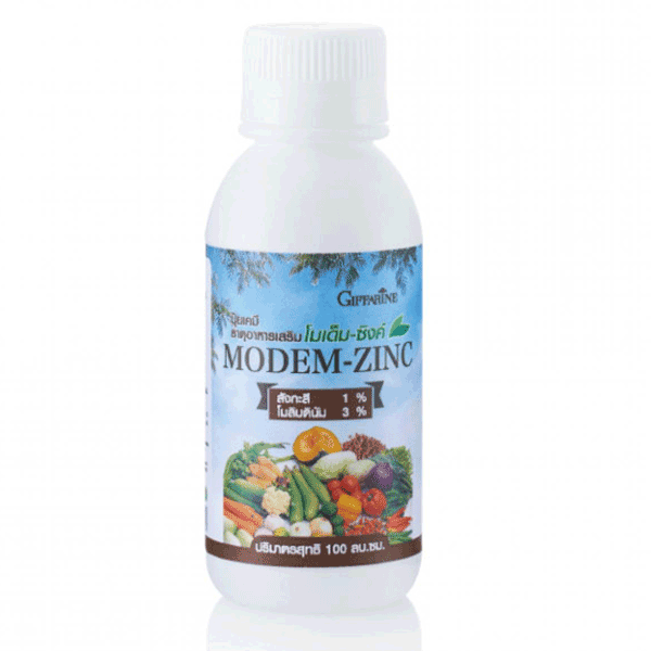 โมลิบดินั่ม : เป็นธาตุอาหารจำเป็นสำหรับพืชทุกชนิดที่ขาดไม่ได้ ถ้าขาด พืชจะไม่สามารถเจริญเติบโตต่อไปได้ โมลิบดินั่มช่วยส่งเสริม ขบวนการสร้างและใช้ไนโตรเจน การสร้างปมของรากถั่ว การตรึง ไนโตรเจนจากอากาศ และการเปลี่ยนรูปไนโตรเจนเพื่อให้อยู่ในรูป ที่พืชใช้งานได้ คุณสมบัติ : โมเด็ม - ซิงค์ คือ ธาตุโมลิบดินั่ม ความเข้มข้น 3% อยู่ในรูปคีเลทของเหลวใส มีความบริสุทธิ์สูงที่พืชสามารถดูดซึม ไปใช้ได้จริง สามารถดูดซึมผ่านผิวใบ หรือส่วนของลำต้นที่มีสีเขียว ได้ดี จึงสามารถผสมน้ำฉีดพ่นทางใบ (Follar application) พ่นใส่ผล โดยตรง ผสมน้ำให้ทางระบบน้ำ (Fertigation) การปลูกพืช โดย ไร้ดิน (Hydroponic) เพื่อให้โมลิบดินั่มกับพืชเวลาที่พืชขาด หรือ เพื่อเพิ่มผลผลิตในระยะที่พืชต้องการโมลิบดินั่มเป็นพิเศษ ธาตุสังกะสี 1% สังกะสีจะช่วยในการยืดยอด กระตุ้นการสร้างฮอร์โมนต่างๆได้